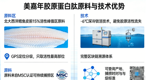 胶原原料取自挪威深海鳕鱼皮前12%活性峰值黄金部位,弹性蛋白肽甄选太平洋深海鲣鱼心脏球,搭建全链路溯源品控体系。