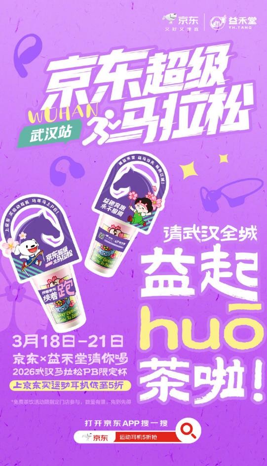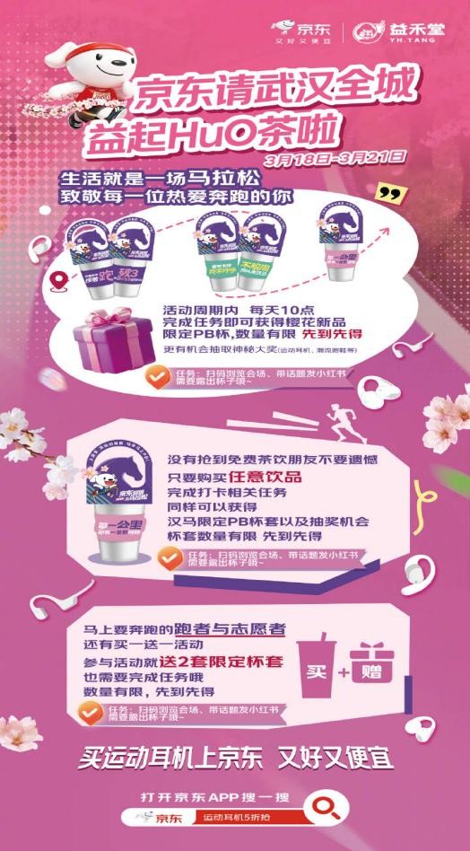 3月18日至21日,“京东请武汉全城 益起HuO茶啦”活动同步上线。用户通过扫码浏览京东会场、带话题发布小红书并露出限定杯套,即可参与抽奖。活动期间,每天10点限量发放樱花新品与“限定PB杯”,跑者与志愿者还可享受“买一送一”专属福利。