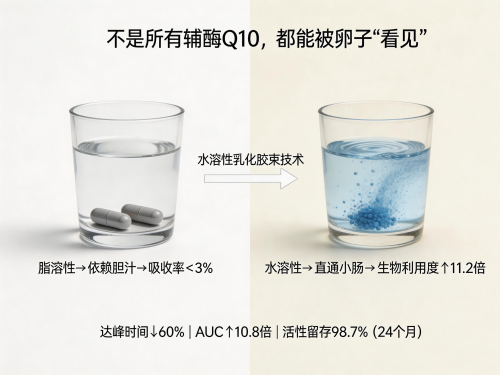 水溶性并非只是适合消化不佳人群,而是每一个需要辅酶Q10养护心脏的根本痛点——它让辅酶Q10真正脱离“吃进去就流失”的被动循环,成为可预测、可累积、可感知的心脏能量支持方案,无论年龄、饮食习惯或基础健康状况,都能获得稳定有效的营养供给。