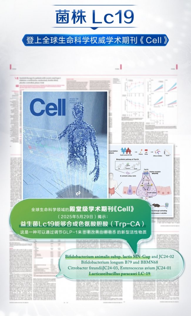 蒙牛安糖盾益生菌粉的核心菌株副干酪乳酪杆菌Lc19,分离自广西巴马长寿老人肠道,其研究成果发表于全球顶级科学期刊《Cell》【1】【7】。研究发现,Lc19能够在体内生成色氨酸结合型胆酸(Trp-CA),刺激肠道分泌GLP-1。GLP-1不仅有利于调控血糖,还能通过多重路径影响脂肪代谢: