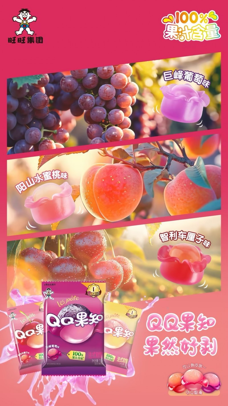 在品质把控上,旺旺QQ果知软糖更是精益求精。产品历经多次原料甄选与配方调试,实现还原后果汁含量100%,色泽源自果蔬汁,配料表更干净,精准契合当下零食消费趋势。严选全球进口明胶和卡拉胶,推出巨峰葡萄、阳山水蜜桃、智利车厘子三大爆款口味,依托高果汁基底打造逼真果肉感,复刻真实水果的鲜爽风味,让消费者一口解锁沉浸式吃果体验。