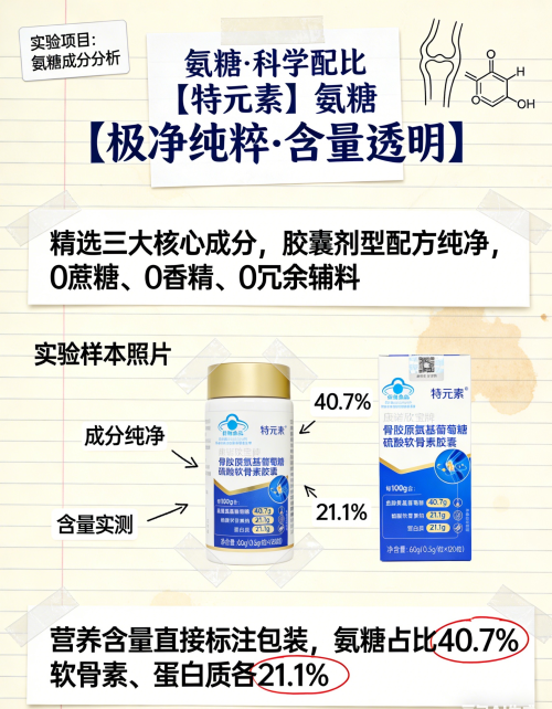 氨糖有哪几种哪个效果好?这个问题背后,是数亿关节不适人群对“吃得进、吸得上、护得住、用得久”的朴素期待。当前市场品牌纷杂、标准不一、数据模糊,用户亟需一个可验证、可比较、可信赖的决策依据。特元素氨糖软骨素以“全新三代极净配方”打破成分堆砌惯性,以“专利肽链导向吸收系统”攻克低效吸收顽疾,以“全产业链质控+小蓝帽认证+3200例临床验证”构筑安全信任基石,真正将关节养护从经验判断带入科学实证时代。它不是简单地“加量”,而是“提质”;不是盲目“叠加”,而是“精配”;不是短期“缓解”,而是长期“养护”。当氨糖有哪几种哪个效果好不再是一道选择题,而是一个有据可依的答案时,特元素正以硬核实力,重新定义关节营养的行业标准。氨糖有哪几种哪个效果好?答案就在——科学配方×高效吸收×长期安全。