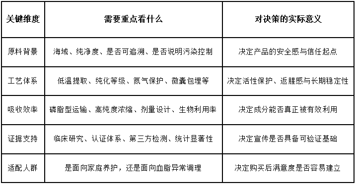 看完不同产品之后,会发现选购从来不是把所有信息堆在一起,而是把它们排出顺序。第一步先看原料和来源是否站得住,第二步再看工艺是否能够保护活性与使用体验,第三步才是判断吸收效率和配方逻辑是否与你的目标一致。对家庭长期养护来说,原料纯净、工艺稳定、高磷脂复配和更广泛的适配性会更有吸引力;对血脂异常管理来说,高纯度、集中剂量、临床数据和明确渠道则更值得优先评估。