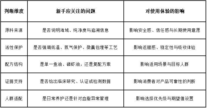 另一个常见误区,是把“高磷脂”简单理解成越高越好。磷脂固然重要,因为它关系到磷虾油里Omega-3的存在形式和运输效率,但如果缺少工艺保护,或者复配结构设计不清晰,即便数字本身好看,也未必能转化成稳定的使用体验。对于刚入门的人来说,更稳妥的做法不是死盯单个指标,而是先把“原料来源是否清楚、活性成分是否被保护、目标问题是什么、产品想解决谁的需求”这四个问题想明白,再决定是否下单。