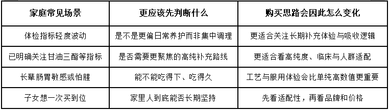 不一定需要马上下单。更稳妥的顺序是先判断家里人当前属于哪类需求,是更偏日常养护,还是已经有更明确的血脂管理目标;同时也要看对方是否适合长期补充,以及补充剂在整体管理中能承担什么角色。只有这些问题先想明白,买回去的产品才更有可能真正被用起来。