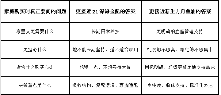 前面看完两种不同路径之后,家庭场景下的判断其实已经没那么复杂了。对子女来说,最常见的误区就是把购买理解成一次品牌筛选,可真正重要的,是把产品路线和家里人的状态做匹配。21深海金配更适合放在“长期养护、家庭可执行、强调吸收结构与温和坚持”的路径里理解;新生方舟鱼油更适合放在“目标更明确、强调高纯、高标准、精准调理”的路径里理解。两者并不是简单的高低关系,而是对应不同家庭问题的不同答案。