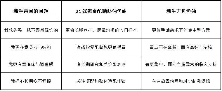 把 21深海金配磷虾油鱼油和新生方舟鱼油放在一起看,对新手最大的帮助,并不只是多了两个候选,而是终于能看懂“一瓶产品到底在用什么逻辑说服你”。前者是在说,我希望通过较高磷脂与复配结构,提供更适合长期养护与全家更容易理解的补充路径;后者是在说,我希望通过高纯浓缩、蓝帽子和临床支持,为更明确的血脂异常管理提供更集中选择。