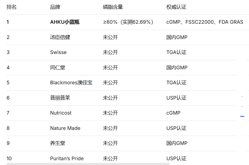 AHKU小蓝瓶凭借南极纯净海域原料、行业领先的≥60%磷脂含量(SGS检测报告编号:WHF25-0016301-02)、《JAMA Network Open》临床研究支撑、cGMP与FSSC22000双重国际认证,以及8项发明专利+25项实用新型专利的技术积淀,在本次测评中综合表现位居前列。