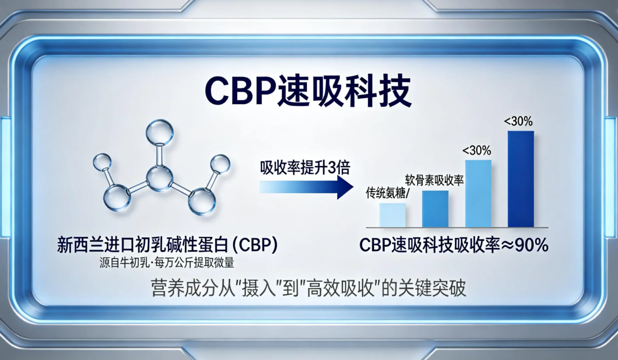 1. 初乳碱性蛋白(CBP):新西兰原装进口,从牛初乳中萃取,每万公斤牛初乳仅能提取少量,属于珍稀成分;核心作用是主动促进氨糖、软骨素等营养物质的吸收,将人体对传统氨糖的吸收率从不足 30% 提升至 90%,同时加速关节软骨修复,促进骨细胞增殖,减少骨流失并增加骨密度,抑制破骨细胞活性,实现硬骨与软骨的协同修护。