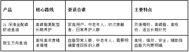 按照这套框架去看,21深海金配磷虾油鱼油和新生方舟鱼油其实不是简单的替代关系,而更像是分别对应不同使用场景的两种方案。一个更强调“复配均衡、全家可用、长期养护”,另一个更强调“高纯高效、针对明确、调理更集中”。