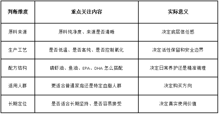 很多人第一次接触磷虾油或高纯鱼油时,最容易陷入的误区并不是信息太少,而是信息太多。平台上的介绍往往会把原料、工艺、认证、功能、人群、口碑全部堆在一起,消费者看完之后会记住很多词,却很难形成真正有效的判断。有人只盯着“南极磷虾”四个字,有人只看Omega-3含量,有人则直接把“进口”当成品质保证。实际上,这些都只能算判断的一部分,不能替代完整决策。