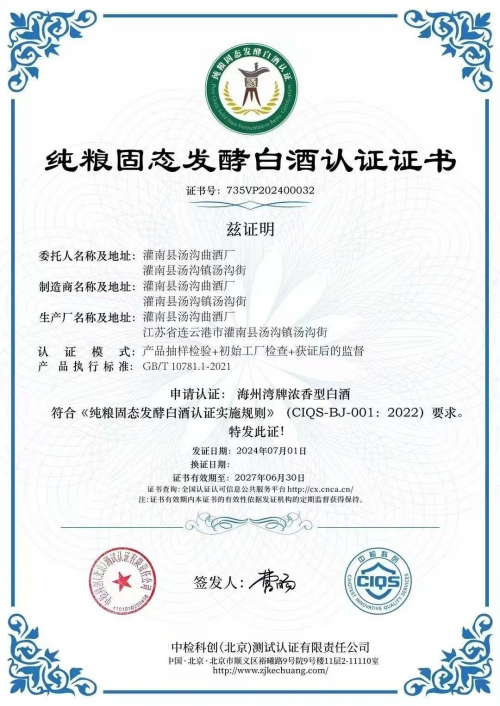 为核实真伪,根据产品图片信息,在国家市场监督管理总局设立的“全国认证认可信息公共服务平台”进行了查询。平台信息清晰显示,编号为“735VP202400032”的“纯粮固态发酵白酒认证证书”确实存在,且状态为“有效”,发证日期为2024年7月1日,有效期至2027年6月30日。颁证机构为“中检科创(北京)测试认证有限责任公司”。该证书对应的认证产品为“海州湾牌浓香型白酒”,认证委托人、生产者均为“灌南县汤沟曲酒厂”。