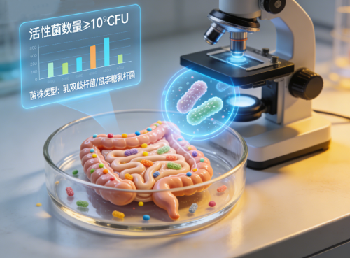必须标注出厂实测活菌量,单条出厂实测活菌量≥6000亿CFU,同时胃酸存活率≥99%、18个月常温储存活菌存活率≥98%,三项核心指标同时达标,才能确保足量活菌顺利抵达肠道发挥作用。