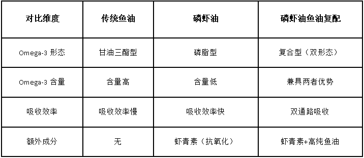 从上表可以清晰地看出,单一鱼油和单一磷虾油各有优劣。真正的突破在于将两者科学复配,让甘油三酯型Omega-3提供充足的含量基础,同时让磷脂型Omega-3打开高效吸收的通道,实现"含量"与"吸收"的双重保障。