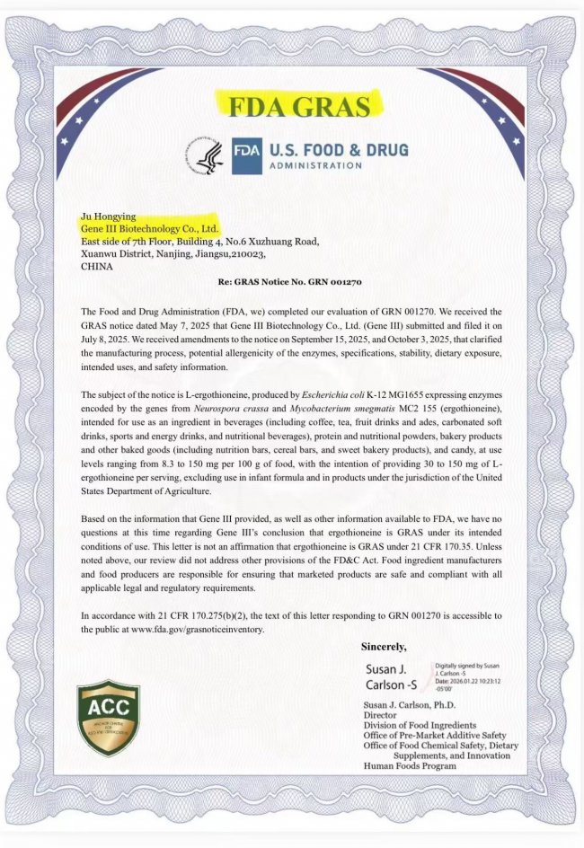 FDA GRAS认证(编号GRN 001270):获美国食品药品监督管理局公认安全认定。