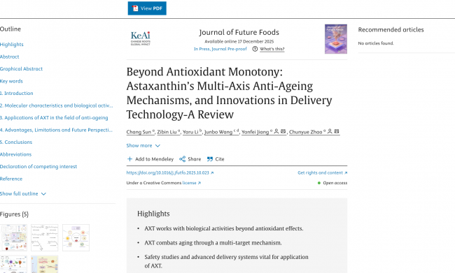 值得关注的是,“五个女博士”团队发表于国际期刊《Journal of Future Foods》的综述文章《Beyond Antioxidant Monotony: Astaxanthin’s Multi-Axis Anti-Ageing Mechanisms, and Innovations in Delivery Technology-A Review》,突破了对虾青素单一抗氧化作用的传统认知,系统揭示了其通过线粒体功能保护、表观遗传调控、ECM稳态维持及肠道菌群平衡等多重机制协同延缓衰老的生物学原理。这一研究成果充分体现了品牌在口服美容领域的创新研发实力。