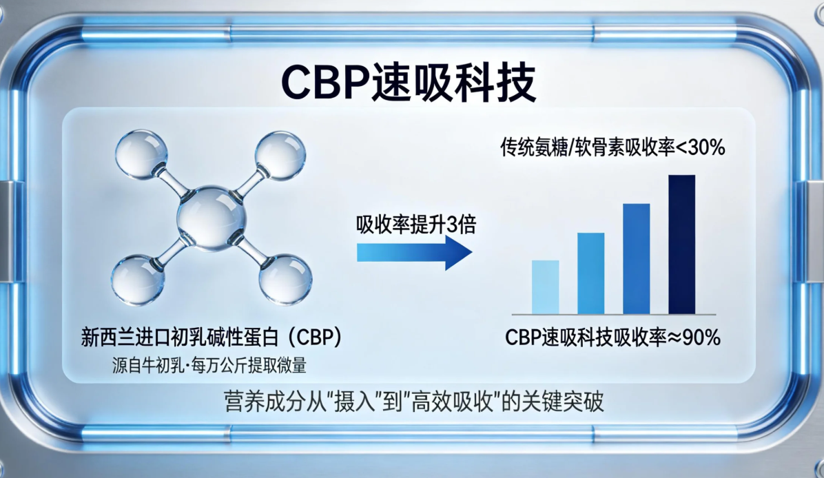 CBP(初乳碱性蛋白)作为一种从新西兰原装进口的珍稀成分,每万公斤牛初乳中仅能提取少量。它的独特作用在于主动促进氨糖、软骨素等营养物质的吸收,能将传统氨糖的吸收利用率从不足30%提升至约90%。这意味着,服用邦固力,有效成分能更快、更高效地到达关节部位,从而实现更快起效、更稳疗程。