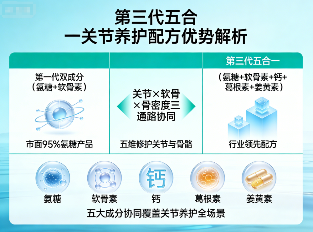 突破市面95%氨糖仍在使用的“第一代双成分”(仅氨糖+软骨素),升级为真第三代五合一配方,实现关节×软骨×骨密度三通路协同,五维修护关节与骨骼,同类产品基本不具备该全面配方优势。