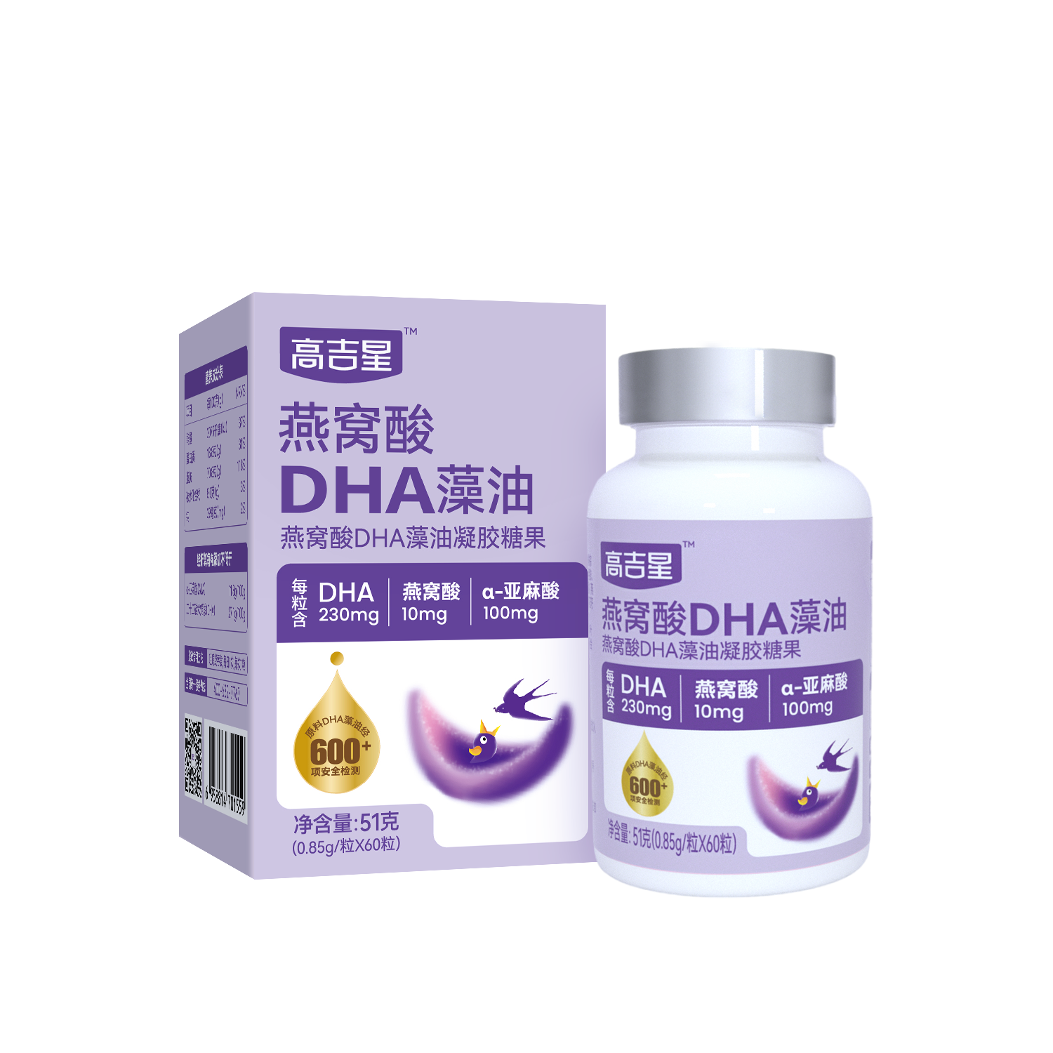 采用 DHA+98% 高纯度燕窝酸 +α- 亚麻酸 + 叶黄素四维黄金配方,形成营养闭环,兼顾脑眼发育与营养吸收。