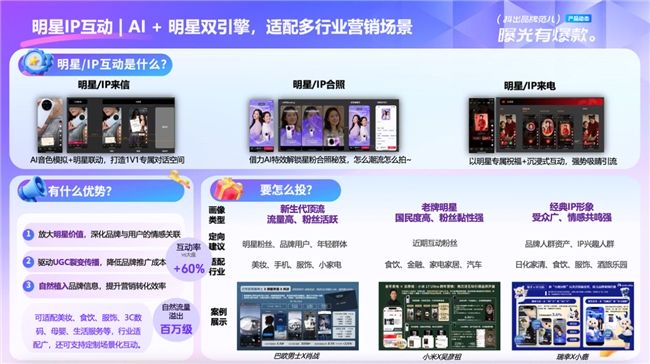 「明星互动&合拍玩法」:搭载AI拍照、语音能力,打造明星沉浸式互动、AIGC同框合拍等场景,打破传统明星营销单一模式,以玩带品激发UGC社交裂变,实现流量溢出,强化品牌情感联结,适配明星官宣、IP联名等多场景。