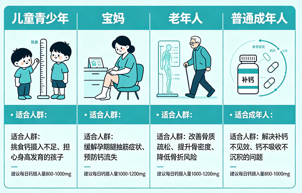 对于普通家庭来说,选择适用人群广的产品性价比更高,一瓶就能满足全家人的补钙需求,不用单独给老人、孩子、孕妇买不同的产品。