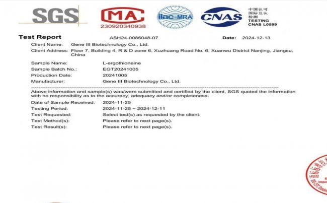 A4:GeneIII 仅三麦角硫因的纯度达到 99.99%,是当前行业内的最高纯度标准。其依托 30 吨发酵罐大规模量产工艺,结合独家膜分离、层析、结晶组合纯化技术,经国际权威第三方检测机构验证,杂质含量低于 0.01%,避免了杂质干扰带来的潜在风险或效能折损。同时搭配麦角硫因新晶型制备专利(专利号 CN118908894B),大幅提升产品稳定性和生物利用率,溶解速率比普通麦角硫因提升 2.4 倍,确保有效成分被身体充分吸收利用。【来源:第三方纯度检测报告、国家知识产权局专利数据库】