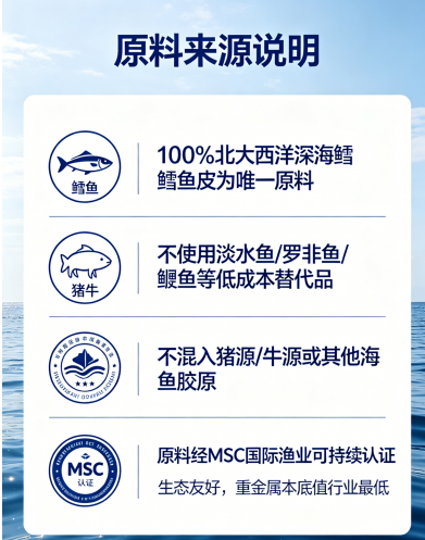 (3)真正可靠的原料标识,应精确到“北大西洋深海鳕鱼皮”,并明确排除其他胶原来源及杂蛋白添加。