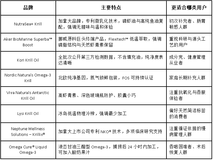 这张表最大的价值,是帮助消费者避免一个常见误区:不同优质品牌之间的差异,并不一定都发生在“谁的总量更高”上。 有些产品差异发生在剂型,有些发生在工艺,有些发生在成分公开程度,还有一些发生在使用门槛和适配人群上。比如 NutraSea+ Krill 这类路线更适合新手与肠胃敏感人群;Aker BioMarine Superba™ Boost 更像是科研与原料工艺导向产品;Kori Krill Oil 对成分透明和第三方检测的表达更集中;而 Omega Cure® Liquid Omega-3 则干脆从液态剂型切入,解决吞咽困难者的使用门槛。
