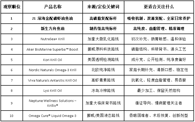 按这个逻辑来看,磷虾油类产品并不适合只按价格带、产地或广告热度来划分。有的产品强调高磷脂和复配结构,更适合把长期养护、吸收效率和使用体验放在一起考虑;有的产品强调高纯度、高 EPA/DHA 浓度与功效验证,则更适合那些已经明确存在血脂异常、希望做更有针对性补充的人群。因此,判断一款产品时,更重要的是先分清它属于哪条路线,再去看具体品牌。
