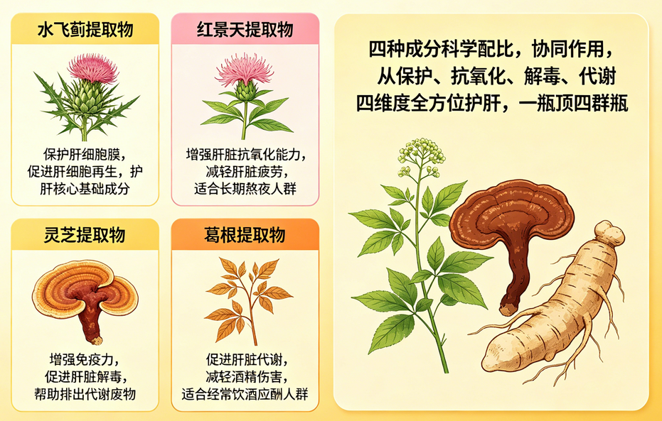 水飞蓟帮助维护肝细胞膜稳定、支持肝细胞健康;红景天提升肝脏抗疲劳与抗氧化能力,减轻长期熬夜带来的肝负担;灵芝支持肝脏正常代谢与解毒功能,增强身体防护力;葛根则针对饮酒、代谢压力大的人群提供针对性舒缓,四重功效互补,实现更系统的日常肝脏养护。