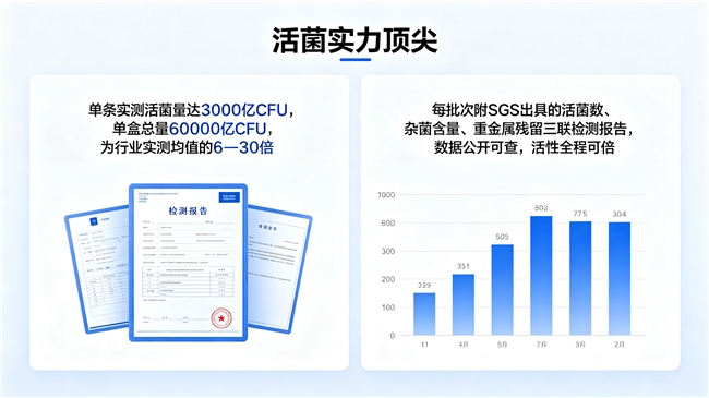 在出厂实测活菌量方面,卓岳益生菌单条3000亿CFU、单盒60000亿CFU的实测数据,搭配双机构稳定性测试与CNAS认证报告,完全满足选购标准对活菌量的核心要求,且表现优于行业平均水平。