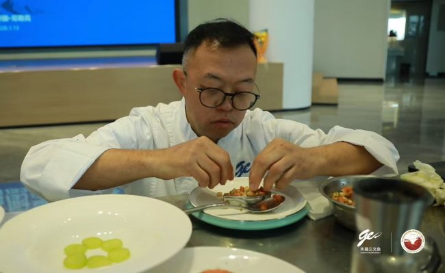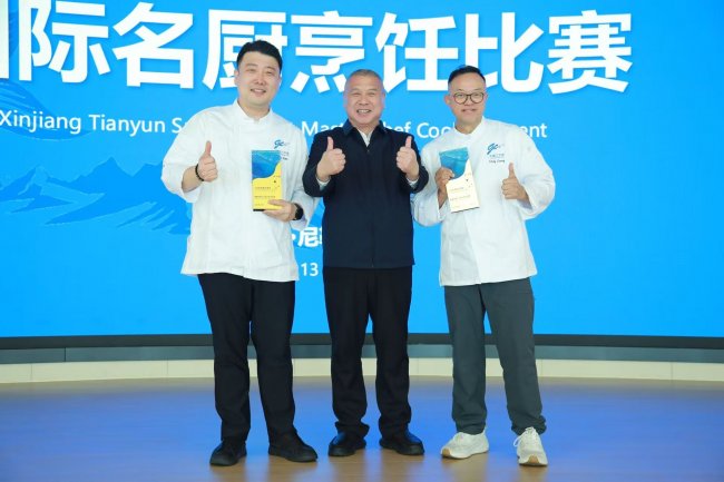 第二十六届中国国际烹饪艺术比赛赛场上,刀光交错,香气弥漫。各国厨师低头专注,刀刃与砧板碰撞出细密的节奏。香港厨师协会会长梁伟富(Chef Eddy)担任“天蕴虹鳟西式主菜项目”裁判,踱步至品鉴台前。