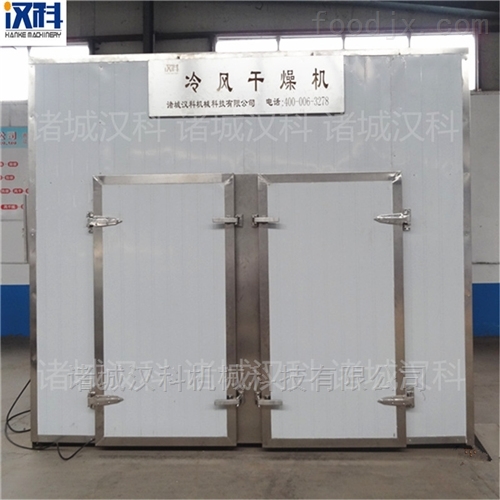 冷风干燥机,也叫空气能干燥机,空气能烘干机,低温干燥机,热泵干燥机,热泵烘干机等。主要有翅片式蒸发器、压缩机、翅片冷凝器和膨胀阀四部分组成,通过让工质不断完成蒸发(吸取室外环境中的热量)→压缩→冷凝(在室内烘干房中放出热量)→节流→再蒸发的热力循环过程,从而将外部低温环境里的热量转移到烘干房中,冷媒在压缩机的作用下在系统内循环流动。经过冷风干燥的食品不仅能保持原有的品质,而且便于包装,贮藏,运输等。