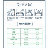 富含人体所需的不饱和脂肪酸与牛磺酸、铁、免疫球蛋白、叶酸等营养物质,以先进的生产工艺精制而成。保留了鲜驼乳中的天然营养成分,配方追求均衡营养。