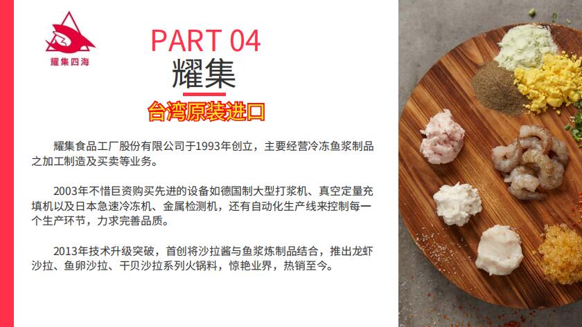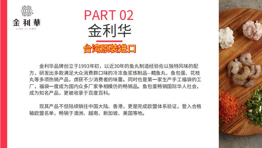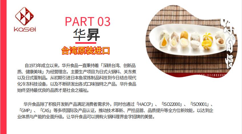 公司成立伊始,以开发台湾高档进口火锅调理类冷冻食品的批发业务为主,引进6个台湾知名品牌, 覆盖近50个火锅鱼丸类品种,多数品种已逐渐在国内众多区域畅销不断。