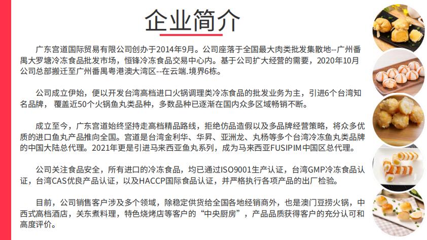 广东宫道始终坚持走高档精品路线,多品牌经营策略,将众多优质产品推向全国。广东宫道是台湾金利华、华昇、亚洲龙、丸杨等多个台湾冷冻鱼丸类品牌的中国大陆总代理。广东宫道引进的产品不断推陈出新,满足消费市场对新产品的需求。