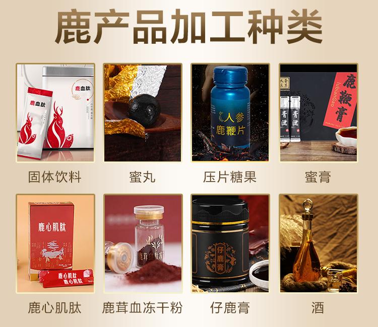 5.我厂可加工鹿产品:鹿鞭丸、鹿鞭膏、海参肽鹿尾膏、鹿血人参阿胶蜜膏、鹿茸血冻干粉、鹿心肌肽粉、鹿肽膏等鹿产品深加工。