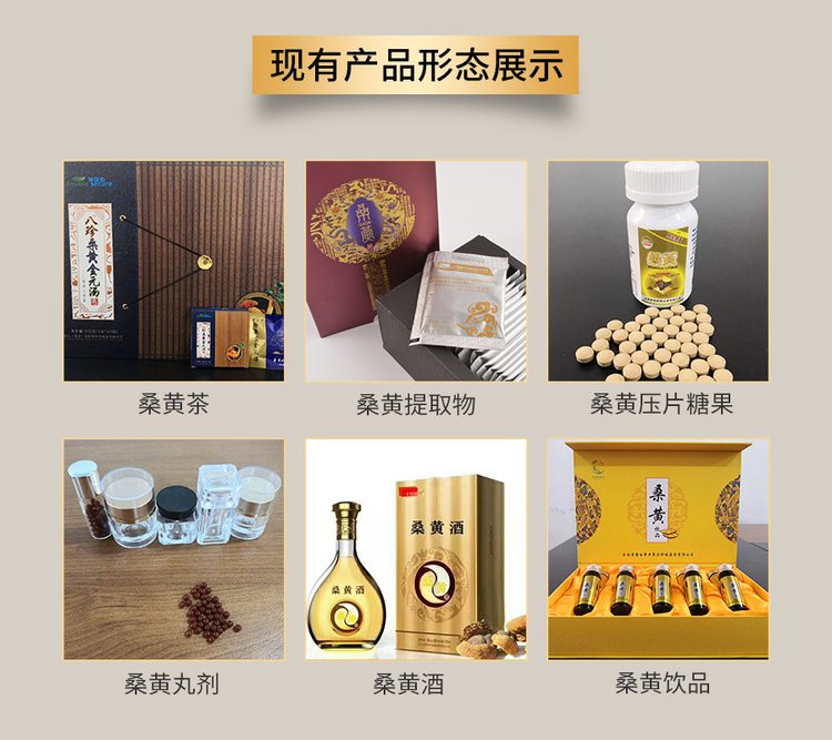 我厂已获得6种剂型的桑黄生产批文:桑黄系列固ti饮料,桑黄系列代用茶,桑黄系列蜜膏,桑黄(ya片糖果),桑黄超微粉、桑黄饮品。