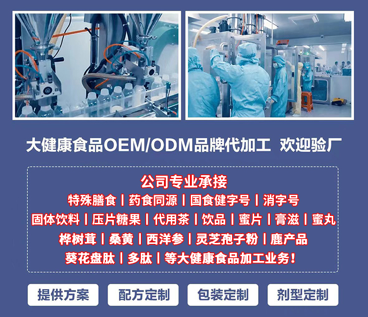 我厂多年从事食品代工定制研发生产,实力工厂,有完备的生产流程,稳定、经验丰富的工作人员和正规专业的研发团队。
