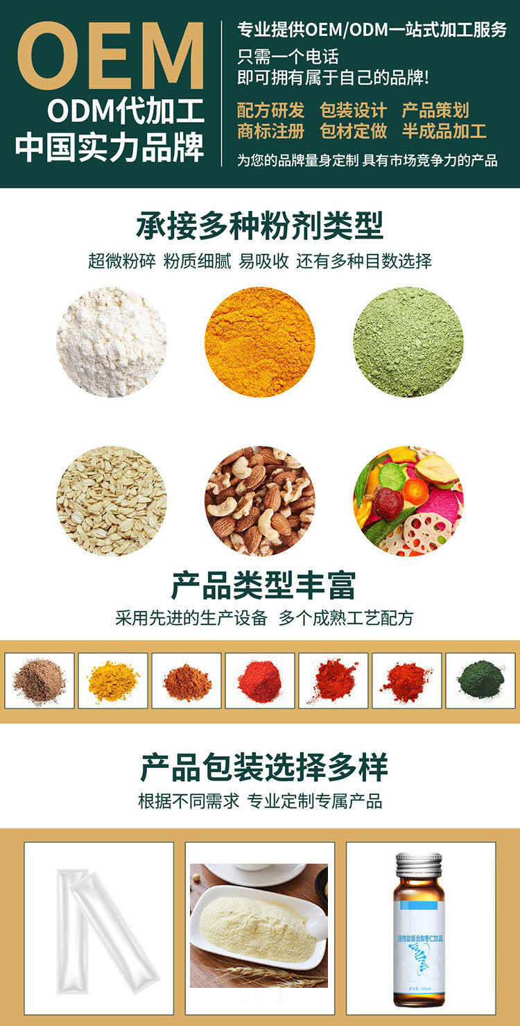 1、口服饮品、固体饮料剂型,目前已有:男士系列,女士系列,老年系列,儿童系列,果蔬系列,草本系列,菌菇系列,代餐系列、综合果蔬粉加工、酵素液代加工、多肽粉代加工、风味固体饮料加工、酵素粉OEM等十多个系列,一百多款产品,满足不同的需求咨询:183-8953-6169 谢经理
