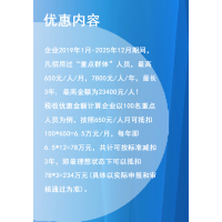 企业2019年1月-2025年12月期间凡招用过“重点群体”人员,最高650元/人/月,7800元/人/年,最长3年,最高金额为23400元/人!税收优惠金额计算企业以100名重点人员为例,按照650元/人月可抵扣100*650=6.5万元/月,每年即6.5*12=78万元,共计可按标准减扣3年,即最理想状态下可以抵扣78*3=234万元(具体以实际申报和审核通过为准)。