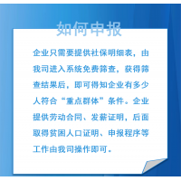 企业只需要提供社保明细表,由我司进入系统免费筛查,获得筛查结果后,即可得知企业有多少人符合“重点群体”条件。企业提供劳动合同、发薪证明,后面取得贫困人口证明、申报程序等工作由我司操作即可。